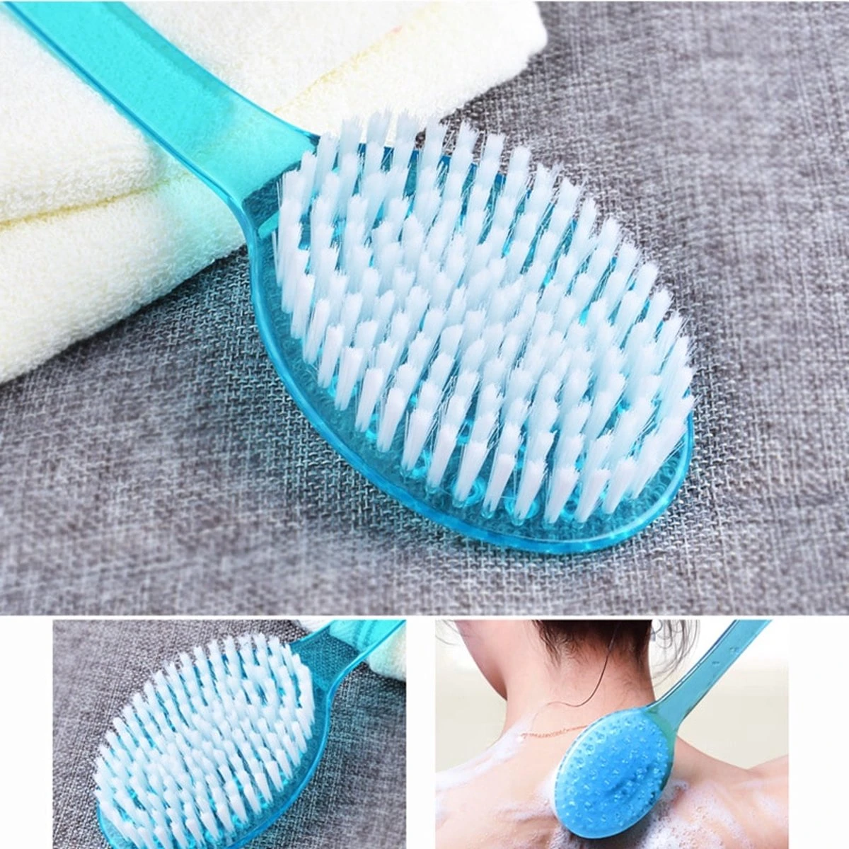 Degelijke en handige massageborstel met lange steel en scrubber, voor het masseren van je rug.