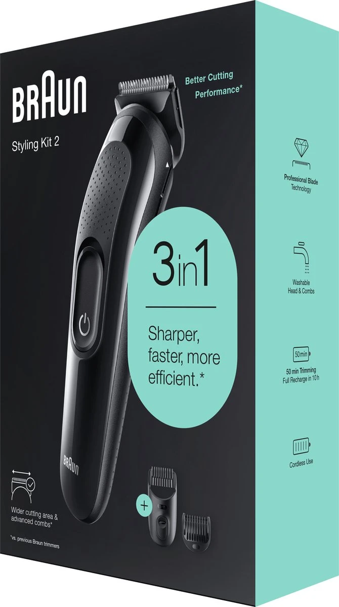 Krijg je stijl in ultieme precisie onder de knie met de oplaadbare SK2 3-in-1 trimmer. Deze baardtrimmer is scherper, sneller en efficiënter, met een breder scheerhoofd om meer haartjes te pakken en te scheren bij elke beweging*. De SK2 biedt 7 lengtes (0,5-11 mm) en levenslang scherpe mesjes, zodat je zeer eenvoudig de stijl kunt creëren die jij wilt voor je baard, gezicht en haar. *t.o.v. vorige Braun trimmers Doos bevat: 1 x Baard- en haartrimmer 2x Kamopzetstuk 1 x Reinigingsborsteltje 1 x Smart plug-lader 1 x Gebruikershandleiding