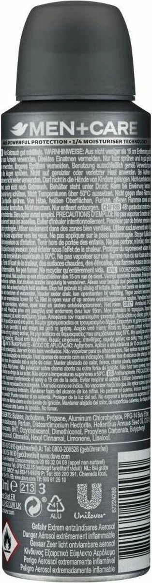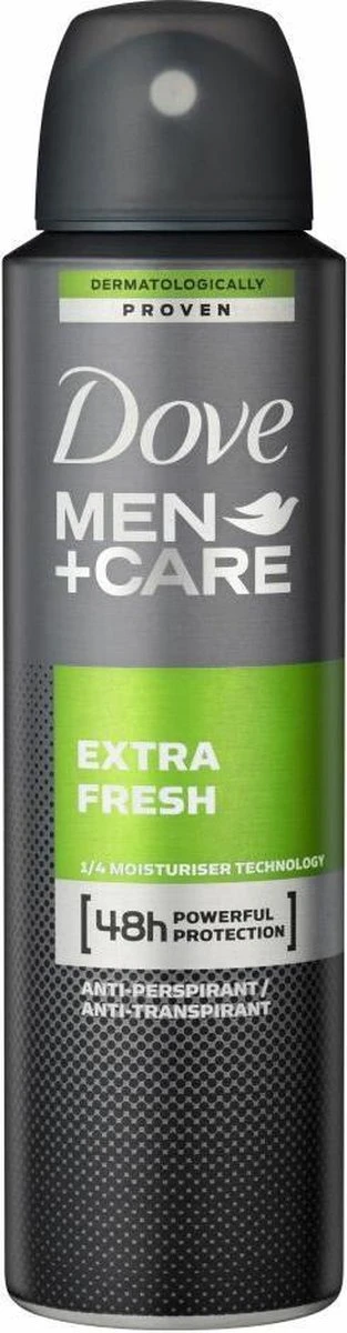 Dove Men+Care anti-transpirant spray is hard tegen zweet, maar zacht voor de huid. Als je regelmatig onderweg bent en veel sport, waardeer je het gemak van een langdurig werkende deodorant spray. Dankzij de dermatologische geteste formule van Dove Men+Care Extra Fresh anti-transpirant spray ben je tot 48 uur krachtig beschermd tegen zweet en ongewenste lichaamsgeuren. Bovendien bevat het de 1/4 hydraterende crème van Dove, die de huid verzorgt en beschermt tegen irritatie onder de oksels. Het extra frisse parfum is de hele dag subtiel aanwezig. Geen compromissen op het gebied van kwaliteit, kracht of comfort.