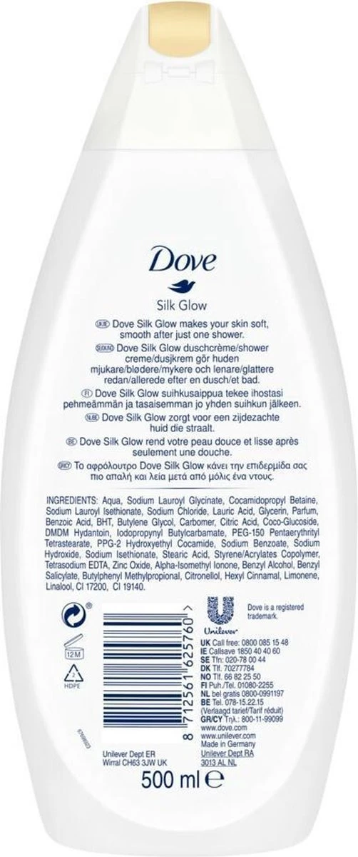 - Dove Silk Glow Douchecrème geeft je een stralende, soepelere huid