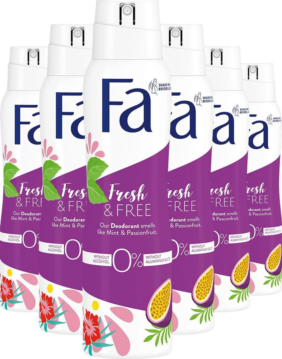Ontdek Fa Fresh & Free deodorant spray met de geur van munt en passievrucht. De vegan formule biedt langdurige bescherming tegen nare geurtjes en bevat 0% aluminiumzouten en 0% alcohol.