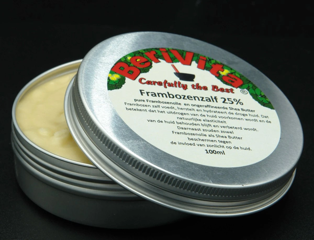 Frambozenzalf bevat 25% pure BeriVita Frambozenolie, raspberry oil, en ongeraffineerde Shea Butter. De Frambozenpitolie in de zalf is koudgeperst en 100% natuurlijk, dus alle goede eigenschappen zijn optimaal aanwezig. Daarnaast bevat Frambozen zalf ook ongeraffineerde Shea Butter, deze boter werkt huid herstellend en is verzorgend. Frambozen zalf heeft geen specifieke geur, we voegen geen geur-, kleur,- en conserveermiddelen toe. Verpakt in een handig aluminium blik met schroefdeksel.