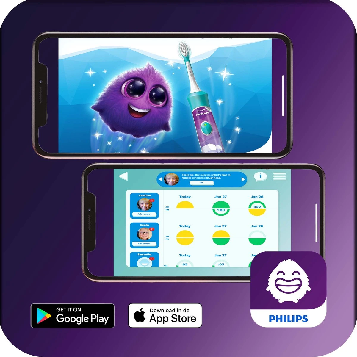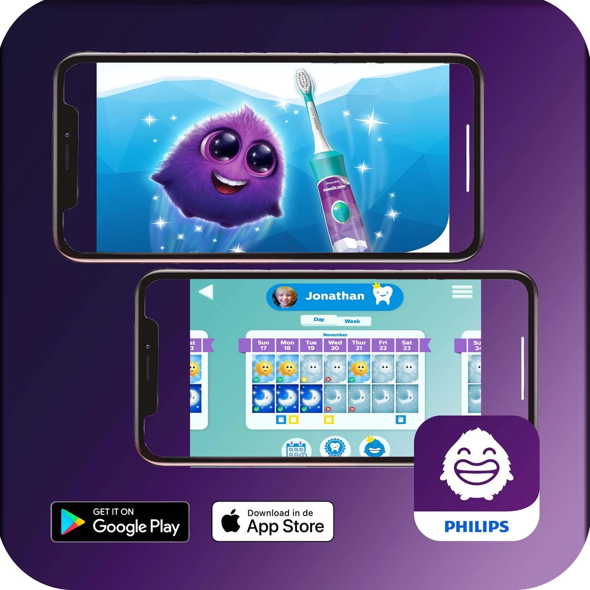 Het plezier begint zodra het tijd is om de tanden te poetsen. Met Sonicare kunnen kinderen gezonde beloningen verdienen om Sparkly te eten te geven, die hen aanmoedigt langer en beter te poetsen.
