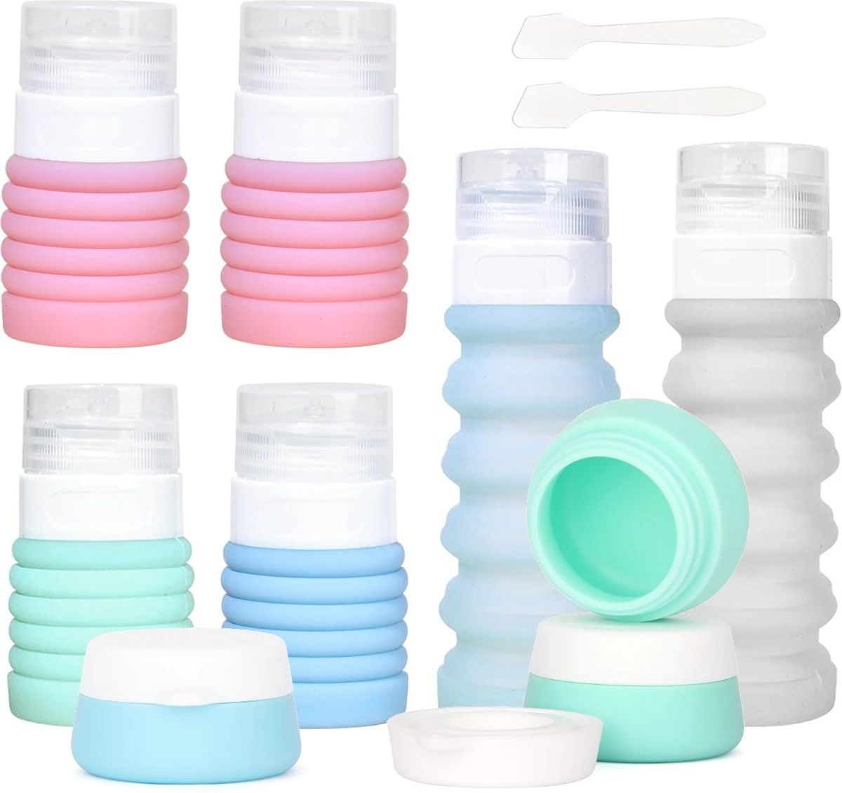 De meest complete reisset voor al je benodigdheden! Vind je het ook zo vervelend als je in je handbagage je douche- en badspullen niet kan meenemen? Dan zijn deze reisflesjes dé must-have voor jou! Deze reisflacons zijn klein genoeg om mee te mogen in de handbagage. Zo kun je dus je favoriete douchespullen gewoon meenemen op vakantie! Gebruik de siliconen flesjes voor shampoo, body wash, conditioner of zelfs zonnebrand. De siliconen potjes kun je gemakkelijk gebruiken voor de crèmepjes. Met de meegeleverde siliconen spateltjes schep je de inhouw makkelijk over, en de anti-lek dop kan makkelijk van de reisflesjes worden geschroefd. Met 4 verschillende kleuren maak je makkelijk onderscheid wat waar in zit of welk reisflesje van wie is. Gebruik je ze allemaal voor andere producten? Gebruik dan de meegeleverde labelstickers om aan te geven wat waar in zit. Zijn de flesjes leeg aan het eind van je vakantie. Schuif deze dan makkelijk weer in om ruimte te besparen in je koffer!