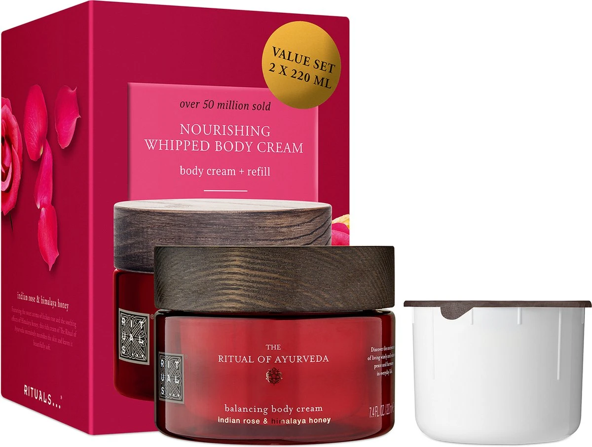 Voordeelverpakking met een pot bodycrème + navulling van The Ritual of Ayurveda.Deze luchtige bodycrème wordt direct door de huid opgenomen en voedt de huid intensief.Combineert het heerlijke aroma van Indiase roos met de verzachtende werking van Himalayaanse honing op de huid, wat lichaam en geest tot rust brengt.