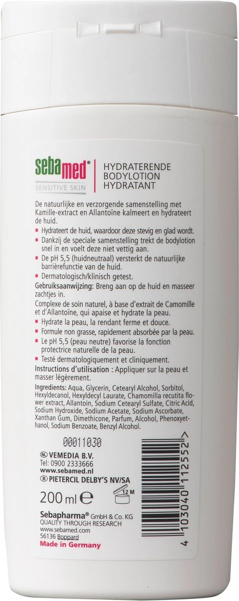 | Ingrediënten | Ingrediënten: Aqua, Glycerin, Cetearyl Alcohol, Sorbitol, Hexyldecanol, Hexyldecyl Laurate, Chamomilla recutita flower extract, Allantoin, Sodium Cetearyl Sulfate, Citric Acid, Sodium Hydroxide, Sodium Acetate, Sodium Ascorbate, Xanthan Gum, Dimethicone, Parfum, Alcohol, Phenoxyet-hanol, Sodium Benzoate, Benzyl Alcohol. |