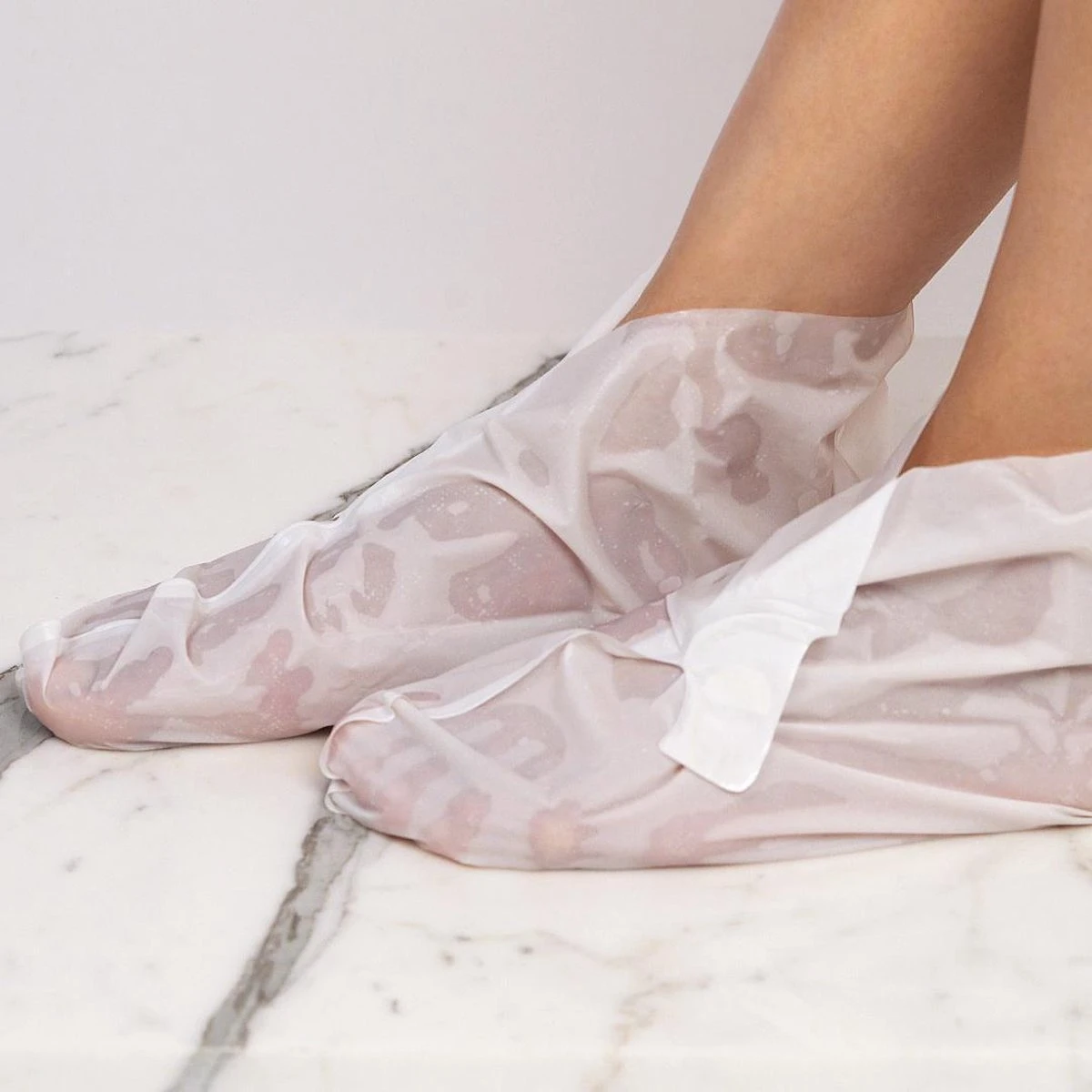 4. Schuif je voeten voorzichtig in de met serum verrijkte vilten binnenlagen. Gebruik de stickers om de sokken goed af te sluiten. Dit zal het sauna-achtige effect stimuleren voor een maximaal resultaat.