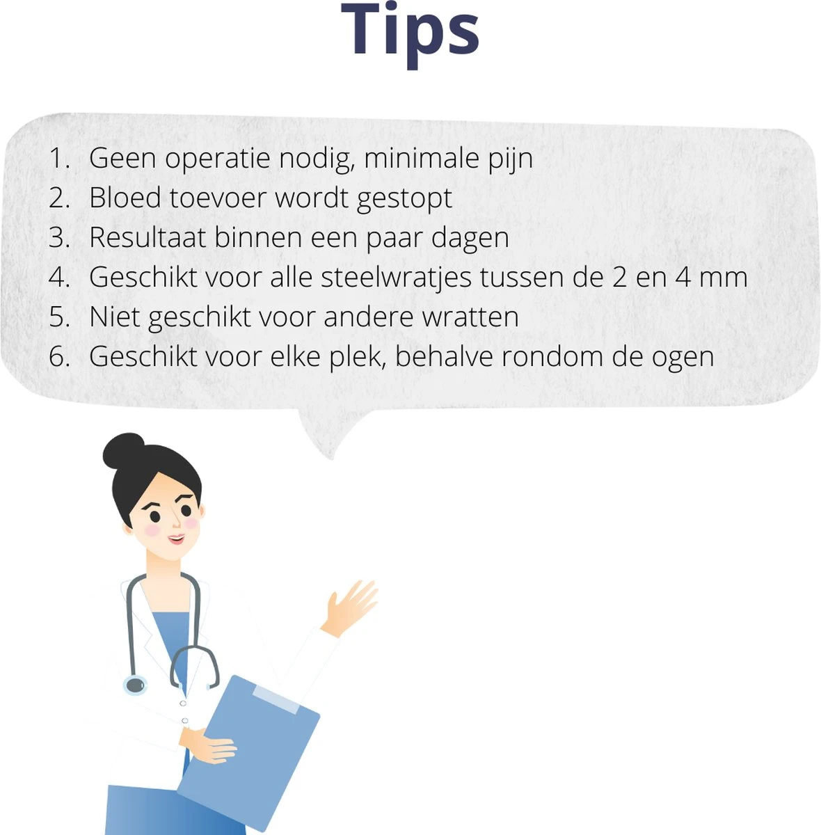 - Uw steelwratje is binnen no-time verleden tijd. Binnen zeven dagen na behandeling bent u doorgaans al van het wratje af.