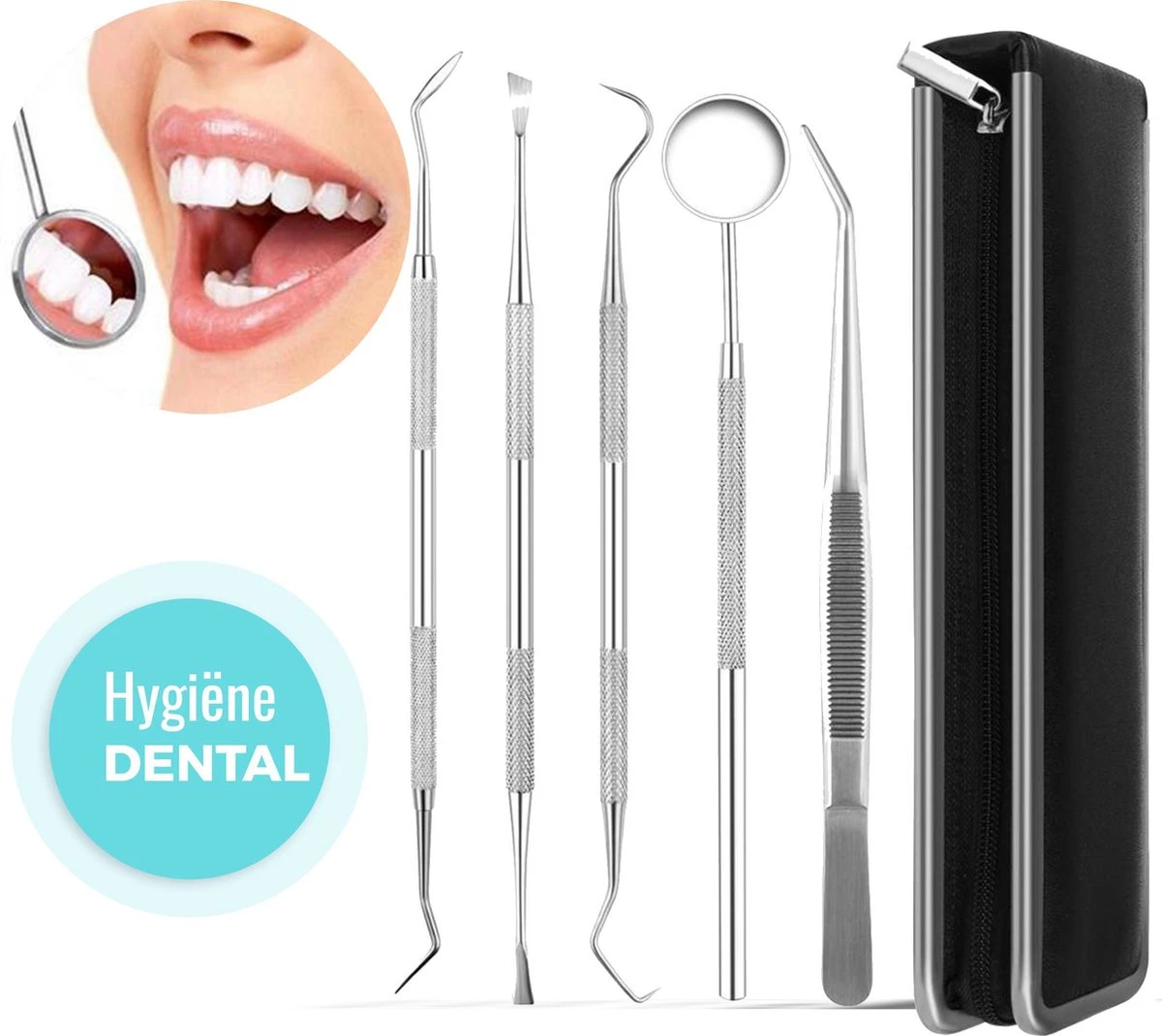 Het complete tandarts setje voor optimale verzorging van uw tanden. Geef uw tanden wat extra aandacht om de tandplak, tandsteen en de aanslag te verwijderen of te voorkomen. Al de gereedschappen van deze tandverzorging set zijn van chirurgisch, roestvrij staal. Dit zorgt ervoor dat het gereedschap niet roest en jij altijd de gereedschappen veilig in je mond kan gebruiken.