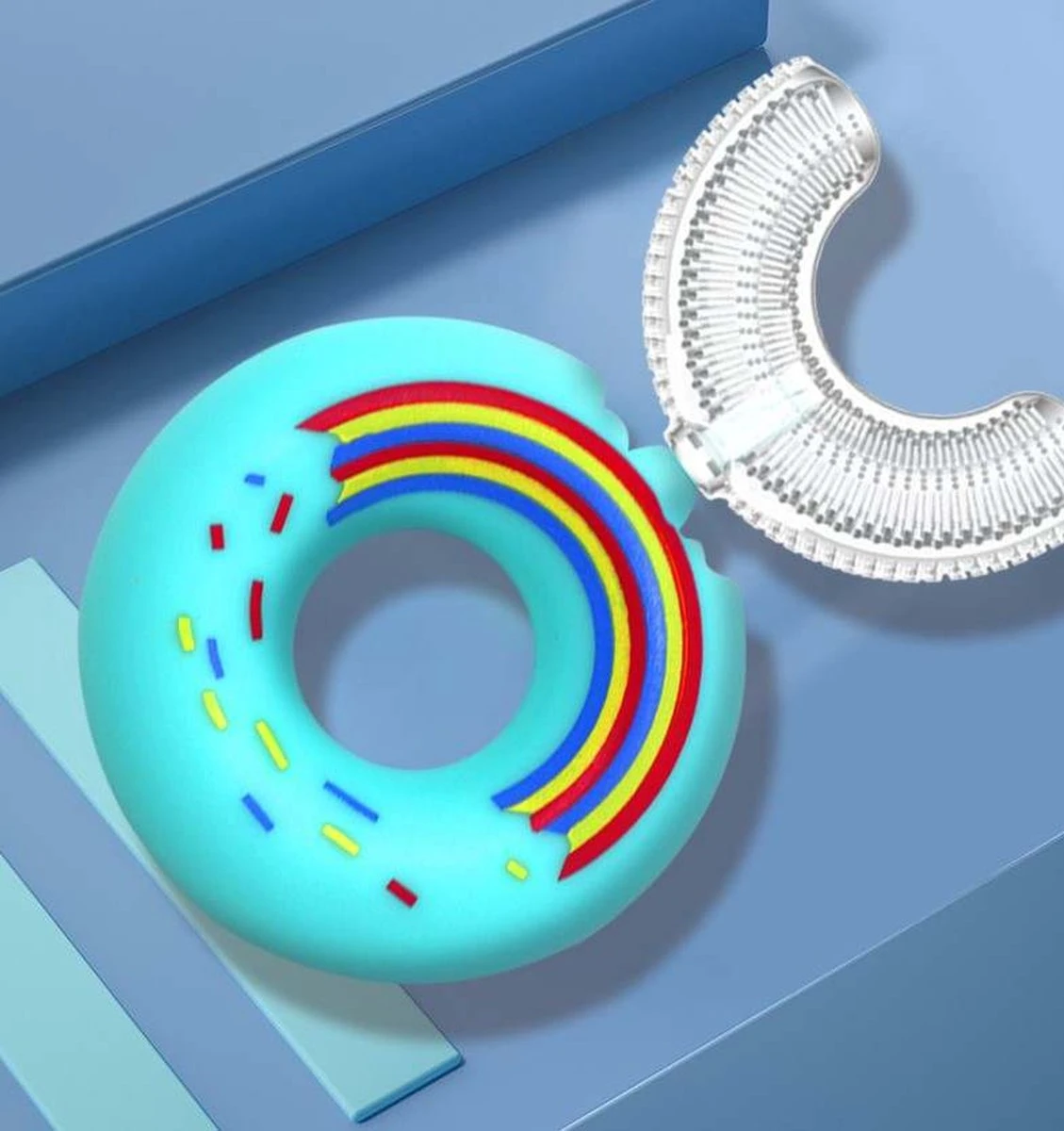 We maken gebruik van een unieke U-vormige borstel. Dit model past beter bij kinderen om hun tanden te poetsen dan de traditionele tandenborstel. Doordat het een U-vorm heeft past het gemakkelijk in de mond van het kind, waardoor hij/zij het makkelijker kan accepteren. En kan het tanden poetsen spelender wijs worden aangeleerd. De uitgebreide borstelkop zorgt voor goede reiniging van tanden zonder dat de kinderen hun pols hoeven te verdraaien.