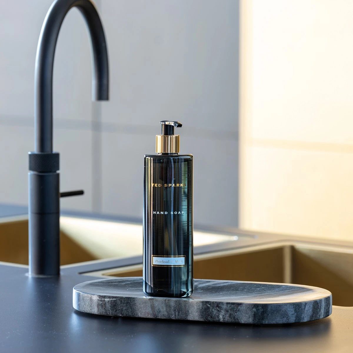 De zwarte handzeep flacon met gouden details is een sfeervolle accessoire voor in de keuken, badkamer of toilet en geeft een rijke uitstraling aan iedere ruimte. De Ted Sparks Hand Soap bestaat uit een pompflacon met een inhoud van 390 ml. De Hand Soap wordt geleverd in een geschenkverpakking.