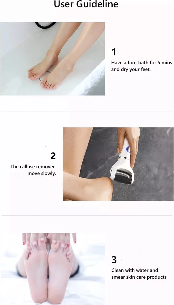 Voorzorgsmaatregelen: alleen gebruiken op harde huid op de voeten. Alleen gebruiken op droge huid (niet vochtig). Niet op andere lichaamsdelen gebruiken. Apparaat alleen gebruiken voor de beoogde doeleinden. Buiten het bereik van kinderen houden. Niet langer dan 3-4 seconden op dezelfde plek gebruiken, laat het apparaat het werk doen. Bij pijn of irritatie direct stoppen. Niet gebruiken op beschadigde, pijnlijke of geïrriteerde huid. Apparaat niet onderdompelen in water. Apparaat is niet geschikt voor mensen met diabetes of problemen met de bloedsomloop. Houd lang haar en kleding uit de buurt van het apparaat wanneer het in gebruik is.